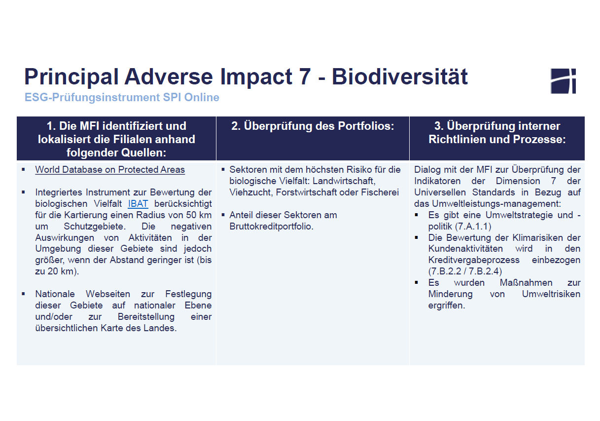 Abbildung: Prüfschema nach PAI 7 Biodiversität für Mikrofinanzinvestoren.